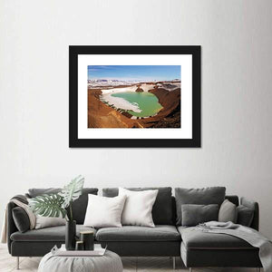 This breathtaking landscape captures the volcanic crater lake of Krafla in Iceland, showcasing its striking turquoise waters against a backdrop of snowy mountains and barren slopes. The stark and remote scene evokes a sense of awe, perfect for adding a touch of nature's power to your decor.