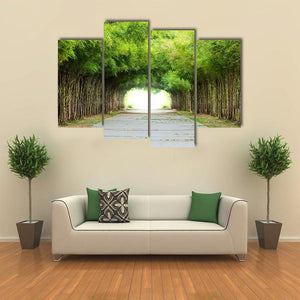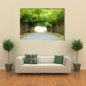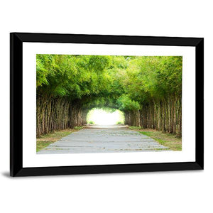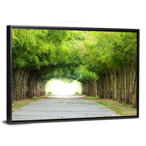 A bamboo tunnel with a stone pathway leads into bright light, framed symmetrically by lush green bamboo. The image feels peaceful, serene, and inviting, using a calming palette of green, brown, gray, and white. Suited to modern or nature-inspired home interiors and room decor.