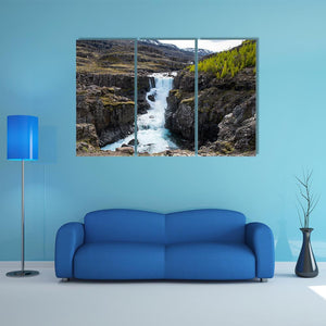 This canvas captures a waterfall on the Fossa River framed by a rocky canyon, lush green trees, and snow-capped mountains in the distance. The nature photography print uses rule-of-thirds composition and a cool green-blue-gray-white palette to convey a serene yet powerful natural mood. It suits modern home room decor and other contemporary interiors.