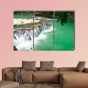 This landscape canvas shows a rainforest waterfall flowing over rocks and framed by lush green foliage, with a long-exposure blur on the water. Its serene, natural mood suits house wall decor and modern, nature-inspired rooms like a living room or bedroom.