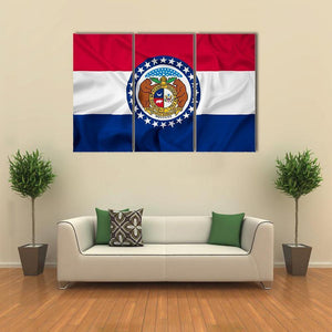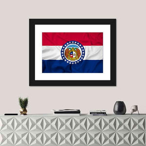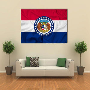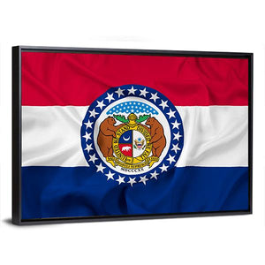 Showcase the Missouri state flag with this canvas print featuring the flag’s seal and a vintage, patriotic look. The symmetrical composition highlights red, white, blue and gold-brown accents for a classic feel. Suits house entryways, living rooms, or modern interiors that welcome flag art.