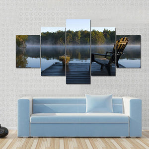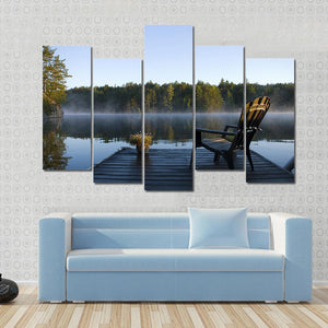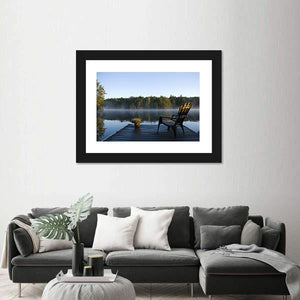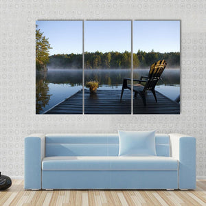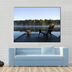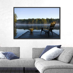 This canvas artwork captures a serene view of Weslemkoon Lake from the dock, featuring an Adirondack chair surrounded by misty trees. The tranquil blue and green palette adds a peaceful touch, making it a beautiful addition to any rustic-themed room.