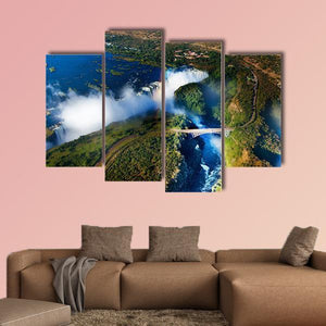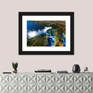 An aerial canvas view of Victoria Falls and the Zambezi River, with the Victoria Falls Bridge and a rainbow visible in the mist. The realistic scene uses blues, greens, whites and browns to convey a majestic, powerful sense of scale. Suits modern or nature-focused rooms like living rooms and home offices.