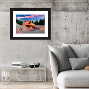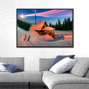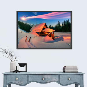 A quiet Carpathian scene in Montenegro featuring a cabin by a snowy mountain and a winter forest at sunset. Soft blues, pinks and whites, smoke from the chimney, and snowshoes in the foreground create a serene, slightly warm dusk mood. Fits nature-inspired or rustic rooms and brings a peaceful, outdoorsy feel to living spaces.