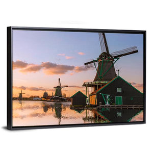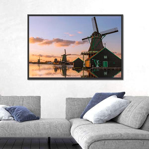 This canvas wall art captures the serene beauty of Dutch windmills reflecting in tranquil waters near Amsterdam. The realistic details and soothing palette of blue, orange, and brown create a picturesque landscape that will enhance any space.