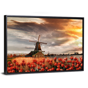 This captivating canvas art features iconic windmills set against a vibrant tulip field and a dramatic sky. With its serene yet nostalgic mood, it brings a touch of the Netherlands to your space.