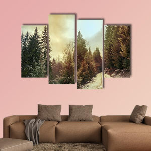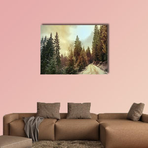 A winter forest scene in the Carpathians with a snow-lined dirt road leading between pine trees. Soft, muted greens, browns, whites and grays and an overcast sky create a serene, somber mood. Works well in rustic or nature-inspired rooms as a calm focal piece.