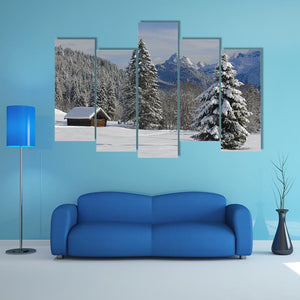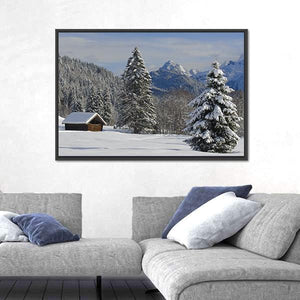 This canvas print features a serene snowy mountain landscape with a cozy cabin and tall pine trees. The cool palette of blue, white, and green creates a peaceful winter vibe, making it a beautiful addition to your home decor.