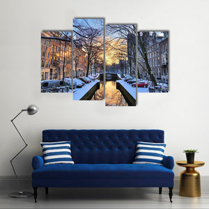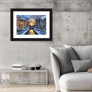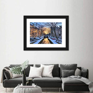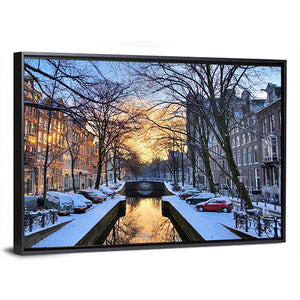 This canvas art captures a serene winter scene along Amsterdam's canals, showcasing symmetrical buildings framed by bare trees and soft snowfall. The peaceful palette of blue, white, orange, and brown evokes a tranquil evening atmosphere, making it a charming addition to any space.