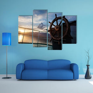 A photographic landscape showing a wooden ship's wheel framed by an ocean sunset, with rippling water, dramatic clouds, and distant mountains. The blue, orange, gold, and gray palette gives a tranquil, quietly adventurous mood that suits house room decor like a living room or bedroom.