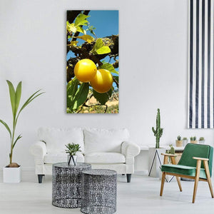 A close-up photographic print of two ripe yellow plums on a branch with green leaves and a summer sky. Bright, fresh, and natural in mood, the image uses yellow, green, blue, and warm brown tones to evoke daytime warmth. Suited to modern or nature-inspired wall decor, it brings a simple, natural touch to a room.