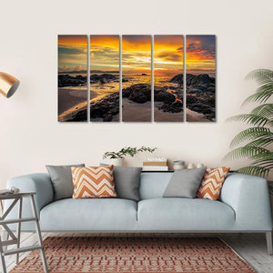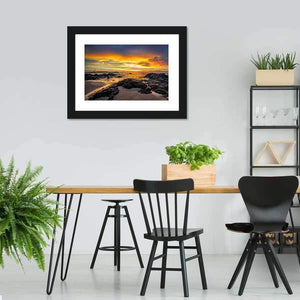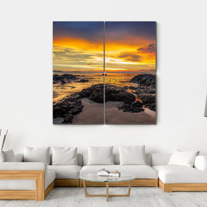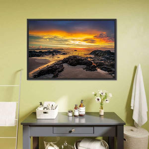 Capture the serene beauty of a yellow sunset over the ocean with this canvas wall art. Featuring wet rocks reflecting light against a backdrop of dramatic clouds, it brings a breathtaking coastal scene to your space.