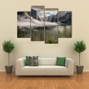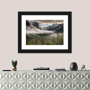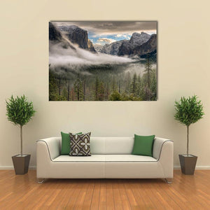 This landscape canvas art captures the majestic beauty of Yosemite, featuring snow-capped peaks and a misty valley enveloped in fog. It's an atmospheric piece that brings a serene touch to any space.