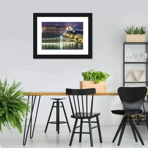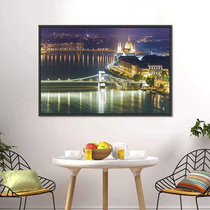 Capture the evening glow of Budapest with this cityscape canvas art. Featuring iconic landmarks like the Széchenyi Chain Bridge and the Hungarian Parliament Building, this piece showcases illuminated details and peaceful reflections on the Danube River.