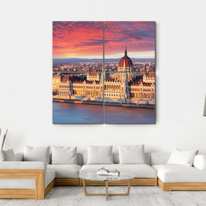 This cityscape canvas features the iconic Parliament building of Budapest, capturing its majestic gothic architecture against a serene sunset sky. The palette of red, orange, and blue brings a dramatic touch to your wall art collection.