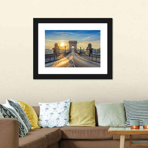 Capture the beauty of the Chain Bridge in Budapest at sunrise with this serene panoramic print. The warm golden light highlights the iconic bridge and stone lions, creating a calming atmosphere perfect for any space.