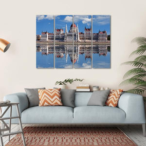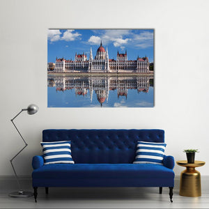 This canvas art showcases the iconic Parliament building in Budapest, beautifully reflected in the calm waters of the Danube River. The grand and majestic scene captures ornate architecture and domed roofs, set against a serene sky filled with clouds.