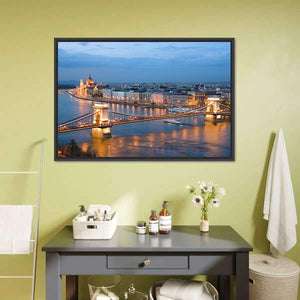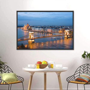 This panoramic canvas captures Budapest’s Chain Bridge and the Parliament building along the Danube at evening, with city lights reflecting on the water. Rendered in a realistic style with a blue, gold, white, and brown palette, it conveys an illuminated, historic, vibrant mood. It suits modern living rooms or offices that favor cityscape wall art.