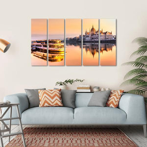 Experience the serene beauty of the Budapest Parliament as the sun rises, casting warm orange and yellow hues across the scene. This majestic artwork captures a boat gently floating on the calm river, reflecting the stunning architecture and vibrant colors.
