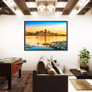 This panoramic canvas art captures the Budapest Parliament at sunset, featuring a serene palette of gold, orange, and brown. With reflections shimmering in the river, it creates a warm and majestic atmosphere, perfect for enhancing any space with a touch of cityscape elegance.