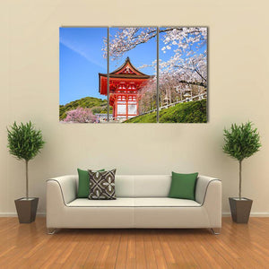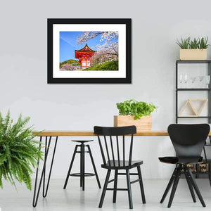 This canvas art features the iconic Kiyomizu Dera Temple, surrounded by delicate cherry blossoms and lush greenery. The serene scene captures a traditional Japanese landscape, evoking a peaceful atmosphere perfect for any room.