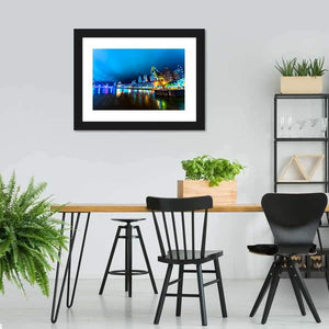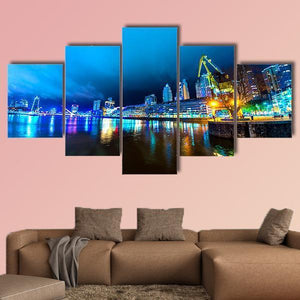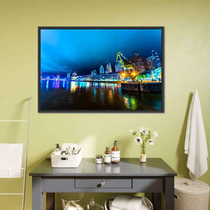 City Lights at Buenos Aires shows a wide-angle city skyline over the harbor with cranes and glowing neon signs. Cool blues, bright yellows and hints of green and purple create a vibrant, energetic urban night atmosphere that suits modern living spaces and contemporary offices.