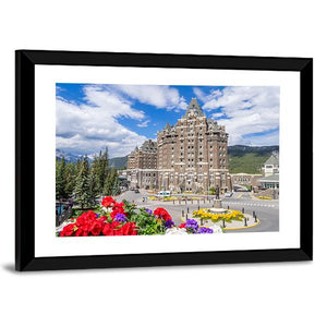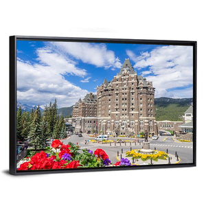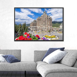 The Banff Springs Hotel Canvas Wall Art shows the ornate hotel building backed by mountains and a bright summer sky, with colorful flower beds in the foreground. Rendered in a realistic style with puffy clouds and vivid greens, blues and reds, it gives a grand, scenic, and bright presence that suits modern room decor.