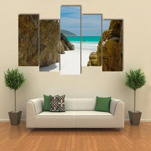 This landscape canvas depicts a beach cave opening to tropical water, light sand, coastal rocks and a distant island under a sunny sky. Composed to emphasize depth and perspective, it carries a serene, sunlit mood that works well with modern room decor or coastal-inspired house interiors.