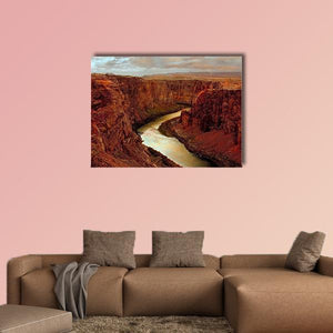 This landscape artwork captures the majestic Grand Canyon at a serene lake, showcasing rocky canyon walls and a winding river. With its rich hues of red, brown, and tan, it creates a vast and calming atmosphere, perfect for any room decor.
