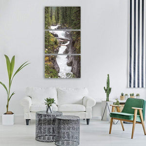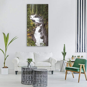 Maligne River in Alberta runs through a rocky canyon framed by tall evergreens. This realistic canvas captures fast-flowing white water, exposed roots and a green-gray palette that feels wild and powerful. It works well in nature-inspired or modern rooms as a strong, natural focal point.