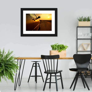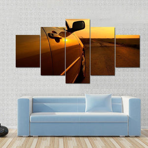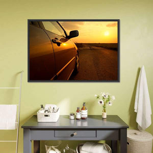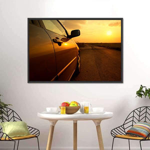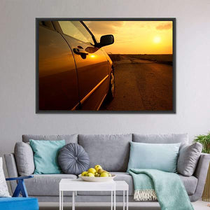 This photorealistic canvas art features a car parked on a dirt road, framed by a serene sunset. The peaceful golden hour light casts a warm palette of orange, yellow, and brown, creating a tranquil atmosphere.