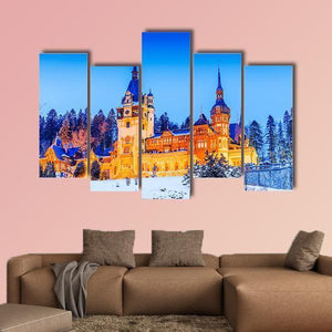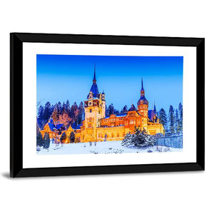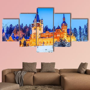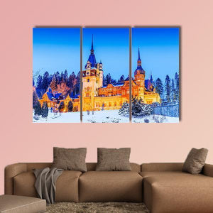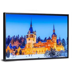 Peles Sinaia In Romania Canvas Wall Art shows a photorealistic winter castle with snow‑topped pine trees, spire rooftops and illuminated windows. The scene reads festive and majestic beneath a clear blue sky and suits modern or traditional wall decor.