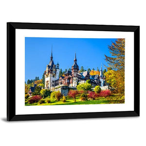 Royal Castle In Romania captures a majestic castle on a tree-lined hillside with multiple spired towers and autumn foliage. Rendered in a realistic, photographic style with blues, greens, reds and warm autumn tones, this scenic print works well as modern living room decor.