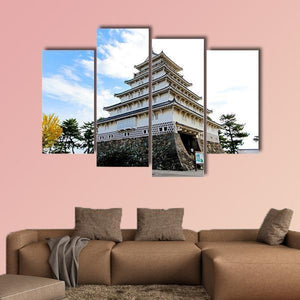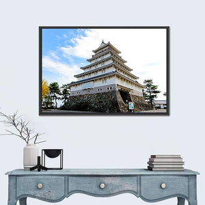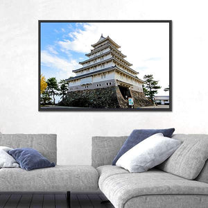 Shimabara Moritake Castle in Japan is presented in a realistic scene that highlights the multi-tiered castle with dark tiled roofs, white walls, a stone foundation and trees at its base. The image reads as majestic and serene, with a palette of white, gray, blue, green and brown, suitable for living rooms or entryways with modern or traditional decor.