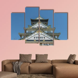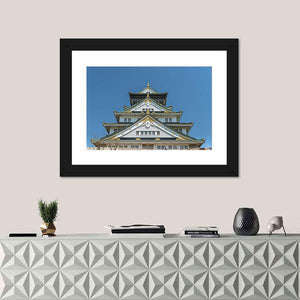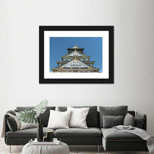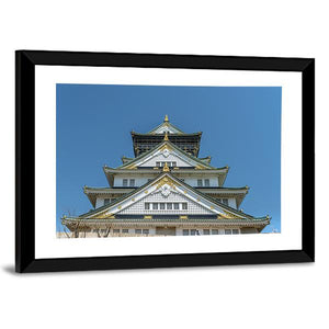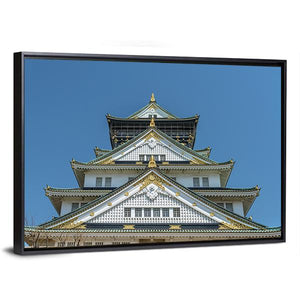 The Osaka Castle Canvas Wall Art presents a low-angle, centered view of a Japanese castle, highlighting its tiered roof and ornate gold accents against a clear blue sky. Calm, historic, and majestic, the print suits room decor that pairs with traditional architecture or modern canvas art.