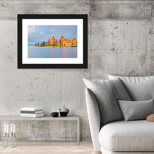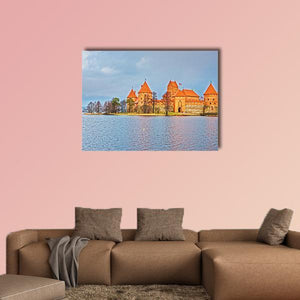 A realistic landscape of Trakai Island Castle Museum at Galve Lake, centered above calm water with stone walls, red-tiled conical towers and bare trees. The blue, orange, brown and grey palette gives the scene a serene, majestic daytime mood. This canvas works well as modern wall art and quiet room decor in living spaces.