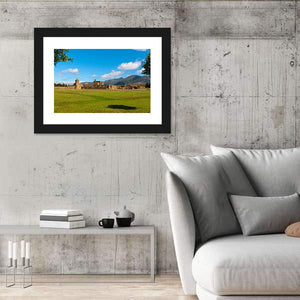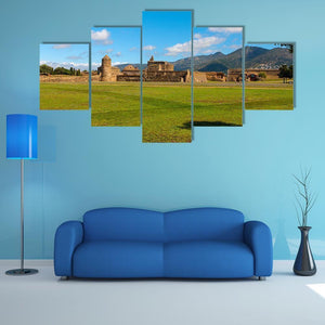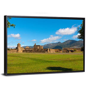 View Of The Medieval Fortress in Roses depicts a sunlit castle and ancient stone walls rising from a grassy field under a blue sky with soft clouds. The photorealistic, serene scene reads as historical and scenic, fitting well in living rooms, studies, or hallways that favor green and blue palettes.