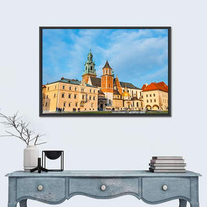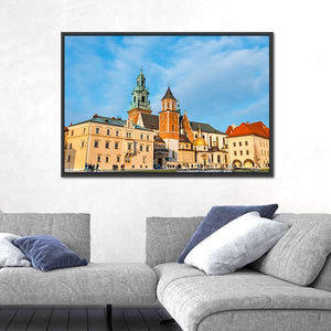 This canvas captures Wawel Castle in Krakow as a wide-angle cityscape, showing golden domes, a tall green tower and people in the foreground under a clear, sunny sky. Rendered in a realistic style with blue, orange and beige tones, it suits modern or historical room decor.