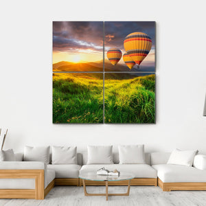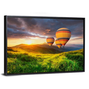 This canvas features three vibrant hot air balloons soaring over majestic mountains at sunrise. The peaceful scene combines greens, yellows, and oranges with dramatic clouds, creating an adventurous atmosphere that suits any living space.