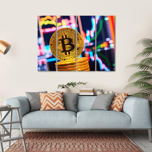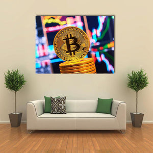 This canvas art captures the dynamic world of bitcoin and cryptocurrency through colorful, abstract financial charts. Featuring a striking palette of gold, blue, red, and green, it brings a modern and digital feel to any space.