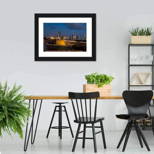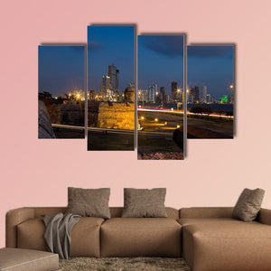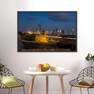 This canvas print shows Cartagena’s colonial fort beside a modern skyline, with cars and streaking vehicle lights captured in a wide-angle, low-perspective view. Dramatic night lighting and a palette of blues, yellows, browns and greys give the scene an urban, atmospheric mood. Works well in modern living rooms or city-themed spaces.