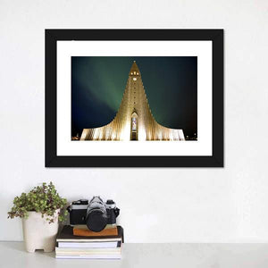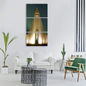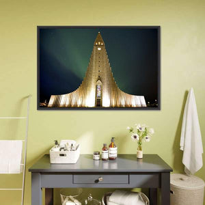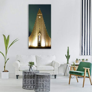 This canvas captures a low-angle, symmetrical view of a Reykjavik church tower and its stained-glass window beneath a starry night sky, with an illuminated facade. The beige, gold, blue, green and red palette gives a majestic, serene mood that works well in modern rooms or entryways looking for a calm focal point.