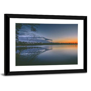 Lake With Clear Sky Canvas shows a realistic lake scene with trees and a sunset reflected in calm water. The blue, orange, green and brown palette and dramatic sky create a serene, peaceful atmosphere. Works well in modern or nature-inspired rooms as a quiet wall accent.