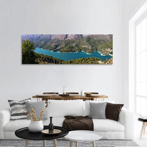 Guadalest Lake, Spain captured in a panoramic landscape—a winding blue lake framed by tree-covered mountains and rocky slopes. The realistic nature-photography style and serene, vast atmosphere make this print a quiet focal point for modern living rooms or nature-themed spaces.