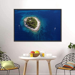 Experience the serene beauty of Island Galesnik from above. This canvas wall art captures a tranquil aerial view of a lush green island surrounded by clear turquoise waters, complemented by small boats bobbing gently. Its modern photorealistic style invites a calming atmosphere to your space.