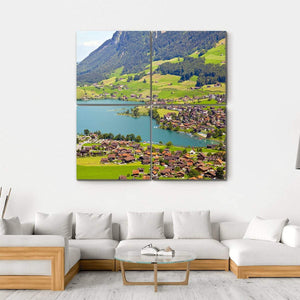 This serene landscape canvas features Lungern Village, showcasing a picturesque lake surrounded by traditional wooden houses and lush green hills. The calming palette of blue and green invites a peaceful atmosphere, perfect for enhancing your living space.