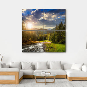 This canvas art beautifully captures the tranquility of a river winding through majestic mountains, surrounded by lush pine trees. The serene palette of green, blue, and yellow evokes a peaceful atmosphere, perfect for bringing a touch of nature indoors.