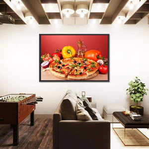 This vibrant canvas art features a delectable close-up of sliced pizza adorned with fresh vegetables like bell peppers, onions, and tomatoes, all drizzled with olive oil. The rich reds, yellows, and greens create an appetizing atmosphere, making it a perfect addition to kitchen or dining room decor.
