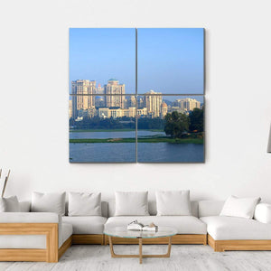 This striking cityscape captures the peaceful skyline of Powai in Mumbai, featuring tall skyscrapers amidst reflective water and lush greenery on islands. The photorealistic design evokes a calm urban vibe, making it a beautiful piece for any modern decor.