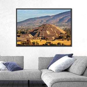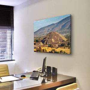 This canvas artwork captures the majesty of the Pyramid of the Sun in Teotihuacan, showcasing a serene landscape filled with ancient ruins. The earthy tones of brown and gold create a historical vibe, perfect for any room in your home.